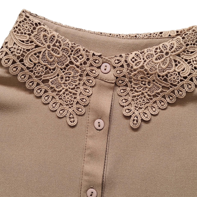 Dit mooie champagnekleur dameskraagje met kant en soepele stof chiffon is een tijdloos accessoire dat nooit uit de mode raakt. De subtiele glans van de champagnekleur en het delicate kant zorgen voor een verfijnde en elegante uitstraling die perfect past bij elke stijl. Voeg dit prachtige accessoire toe aan je garderobe en transformeer elke look in een handomdraai.