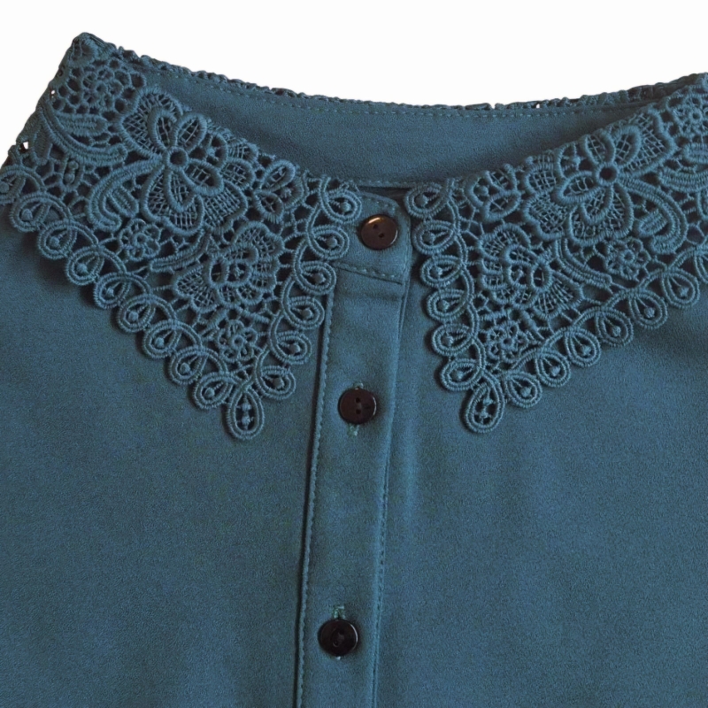 Verrijk je outfit met dit charmante groene kraagje, subtiel versierd met delicaat kant. Dit accessoire voegt moeiteloos een vleugje vintage elegantie toe! Ideaal om een simpele look te transformeren in iets speciaals, of om je liefde voor unieke details te tonen.
